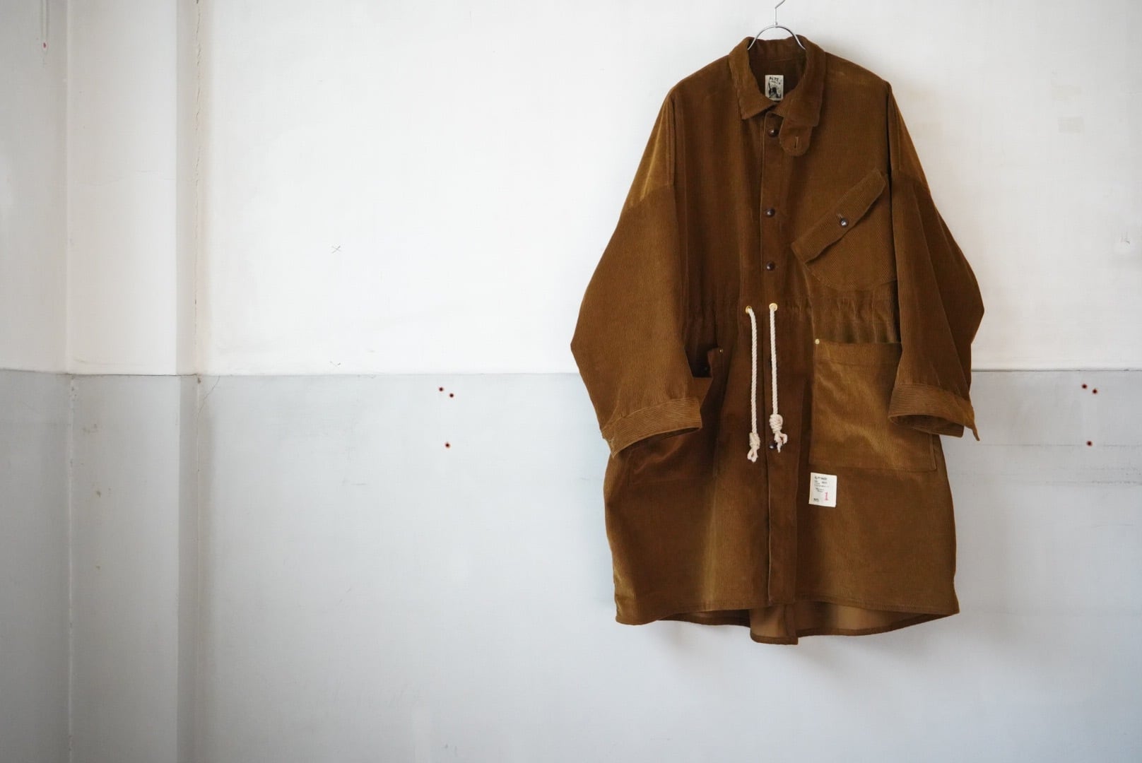 ブラックの太畝のコーデュロイをばさっと羽織る大判のコート。 特徴的な襟付けのチンストラップと大きなフラップやパッチポケットなどALTT MADE らしいディテーリィな洋服です。 緩いシルエットでも、シャープな印象を脱したいブラックはウエストコードを外したデザイン。 ナット釦の艶が金属見えするのは生地の素材感とのコントラストで。 チェストポケットの向きをブラウンと左右反転させているのは ALTT MADE らしい遊び心です。 Material : cotton 100% Color : brown Size : free 肩幅 : 78cm 身幅 : 91cm 着丈 : 112cm 袖丈 : 46cm 生地の風合いや状態など個体差のある商品です。 詳しくはお問合せください。 お電話、メール、インスタグラムのメッセージ。 なんでも結構です。