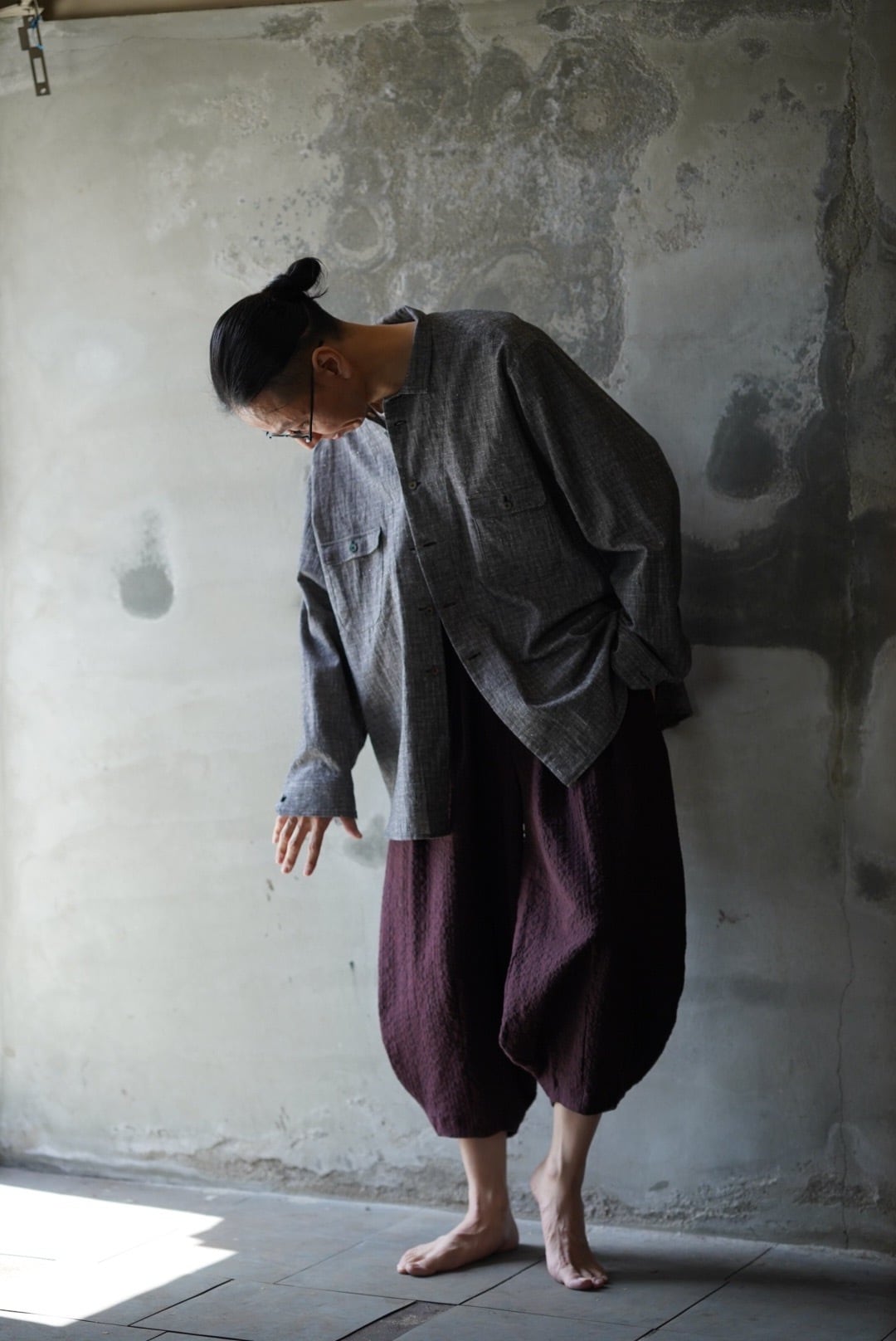 尾州で強撚のウールを製織した綾目のしっかりとしたサージ生地。 元来の軍服や学生服に使用されるほんのりと品が漂う質実な生地を、ワイドシルエットのイージーパンツに仕立てました。 特徴的なフロントポケットは、穿き位置を高くウエストを絞ることで軽く口を開く仕様。 パンツを立体的に、愛想よく見せるデザインになります。 緩くボリュームのあるイージーパンツながら軽くテーパードしたシルエットで立ち姿が綺麗に見える洋服です。 ジャケットとの相性がよく、共地のサックジャケットとセットアップになります。 Material : wool 100% Color : c.grey Size : 1 ウエスト : 76-106cm 股上 : 34cm 股下 : 73cm わたり : 37cm 裾幅 : 23cm Size.2 ウエスト : 78-108cm 股上 : 35cm 股下 : 75.5cm わたり : 39cm 裾幅 : 24cm 他、詳しくはお問合せください。 お電話、メール、インスタグラムのメッセージ。 なんでも結構です。