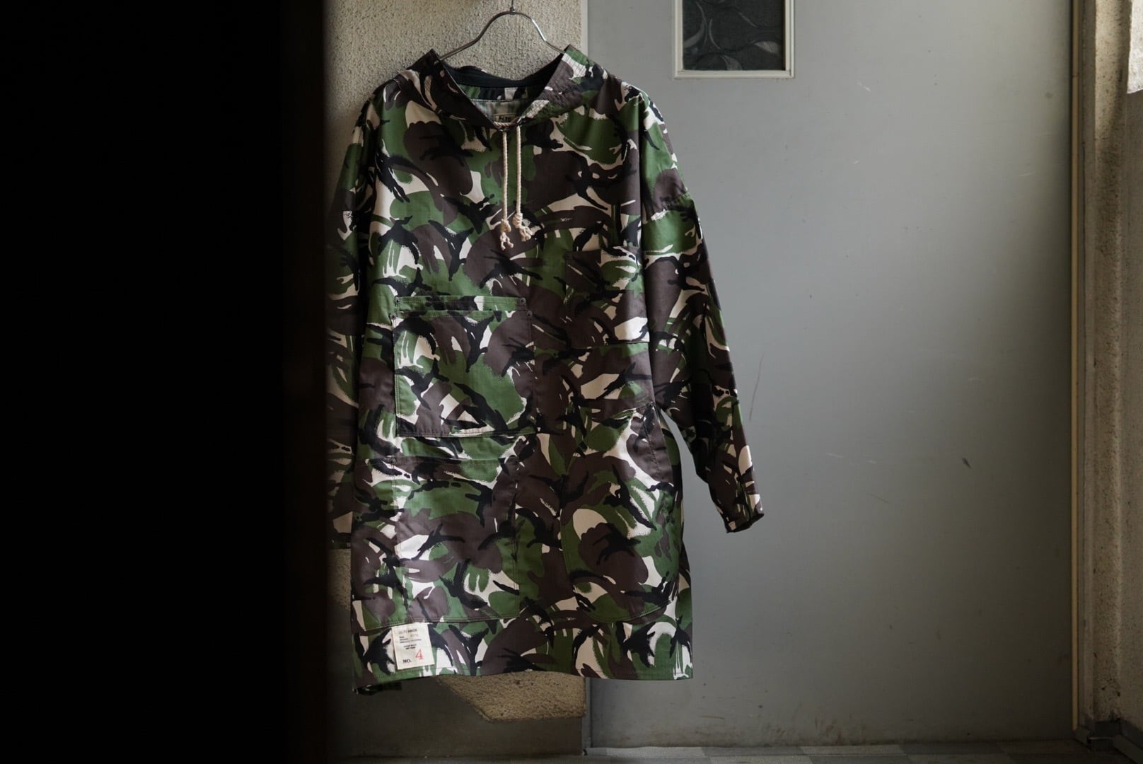 深い色味と艶感のある国産のモールスキンを使用した、フーディ。 身構えるほど重くも硬くもないが、ガチガチに詰まったドライな肌触りの生地。 4枚接ぎの立体的なフードや全体のディテールは40年代の山岳部隊をイメージソースに、メタルの縫い付けのボタンがズラッと並ぶフロントディテールのインパクトがある洋服です。 テント生地ほどの厚みと目の詰まりがギアとしての洋服の側面を支えながら、色の深みや光沢とのコントラストが洒落着としての魅力を引き立てます。 もちろん、これだけ目の詰まったモールスキンなら小雨程度ならレインコートがわりにフードで凌げます。 そういう着方も含めて格好の良い洋服です。 Material : cotton 100% Color : brown Size : free 肩幅 : 60cm 身幅 : 74cm 着丈 : 80cm 袖丈 : 58cm 生地の風合いや状態など個体差のある商品です。 詳しくはお問合せください。 お電話、メール、インスタグラムのメッセージ。 なんでも結構です。