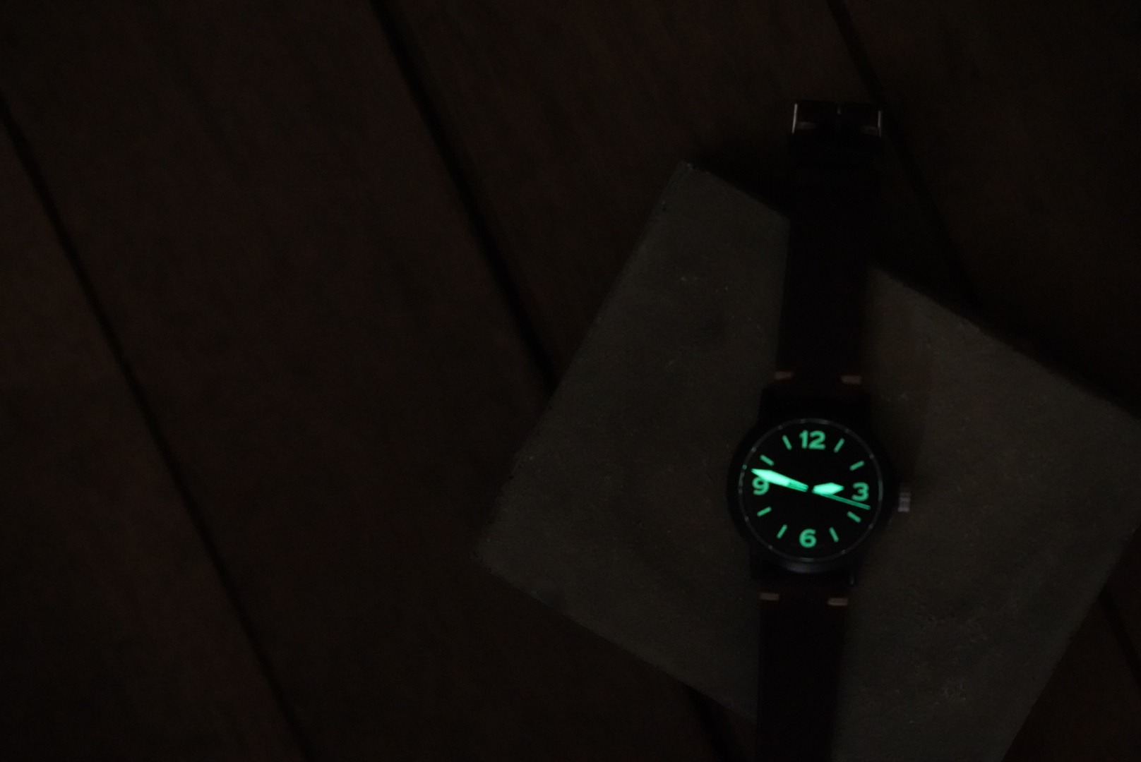 日が落ちると、蓄光したインデックスと針が明るく浮かぶ仕様。