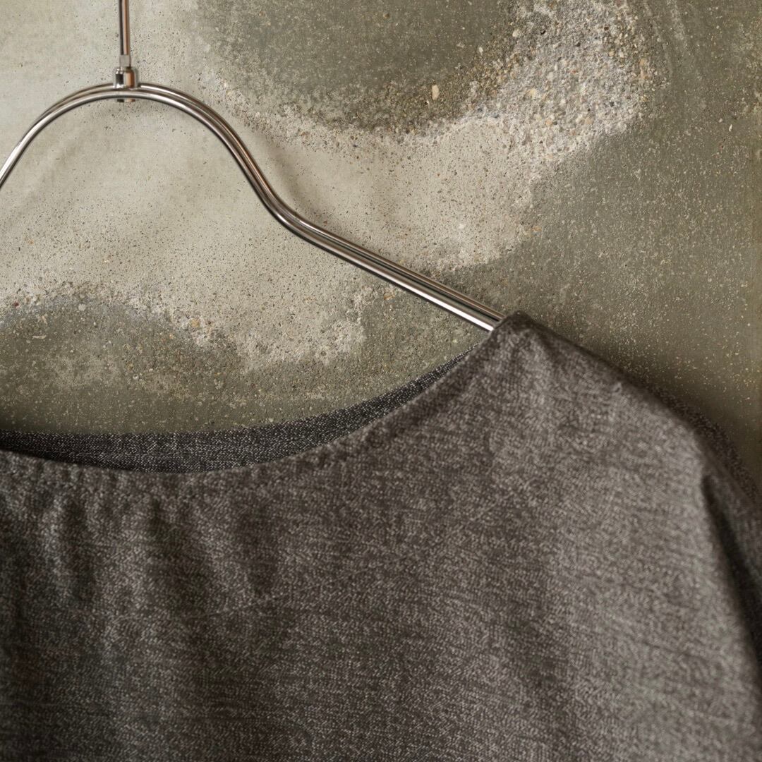 広い首ぐりと、軽い仕上げの袖口。