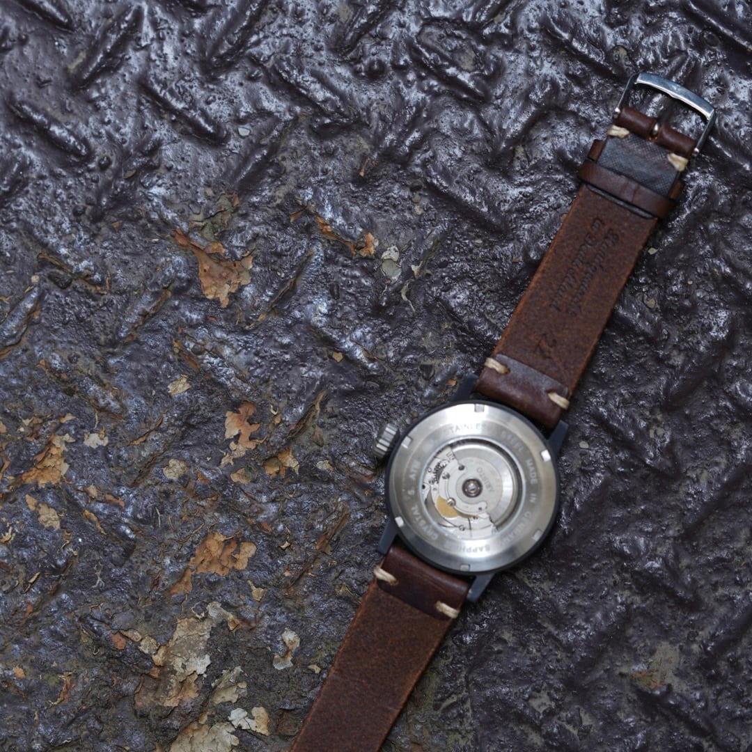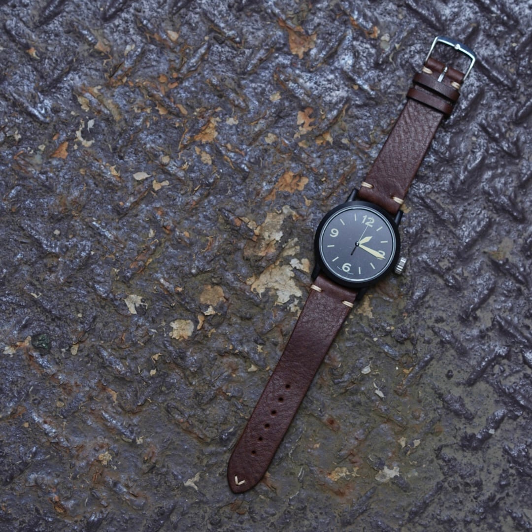 黒のケースと焦茶のレザーベルトのクラシカルなミリタリーウォッチ。