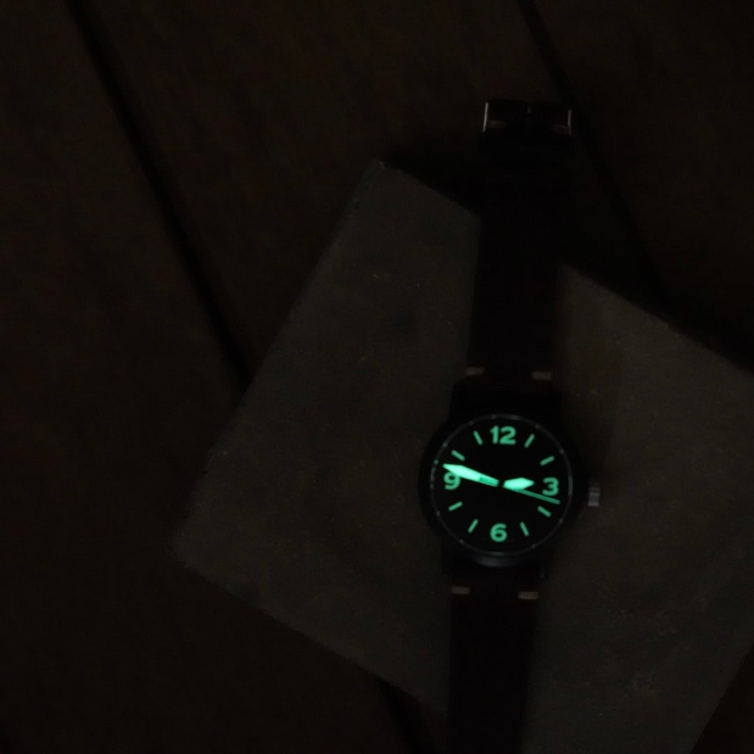 黒の文字盤のミリタリーウォッチらしく、暗闇では淡く針や時刻が浮かびます。