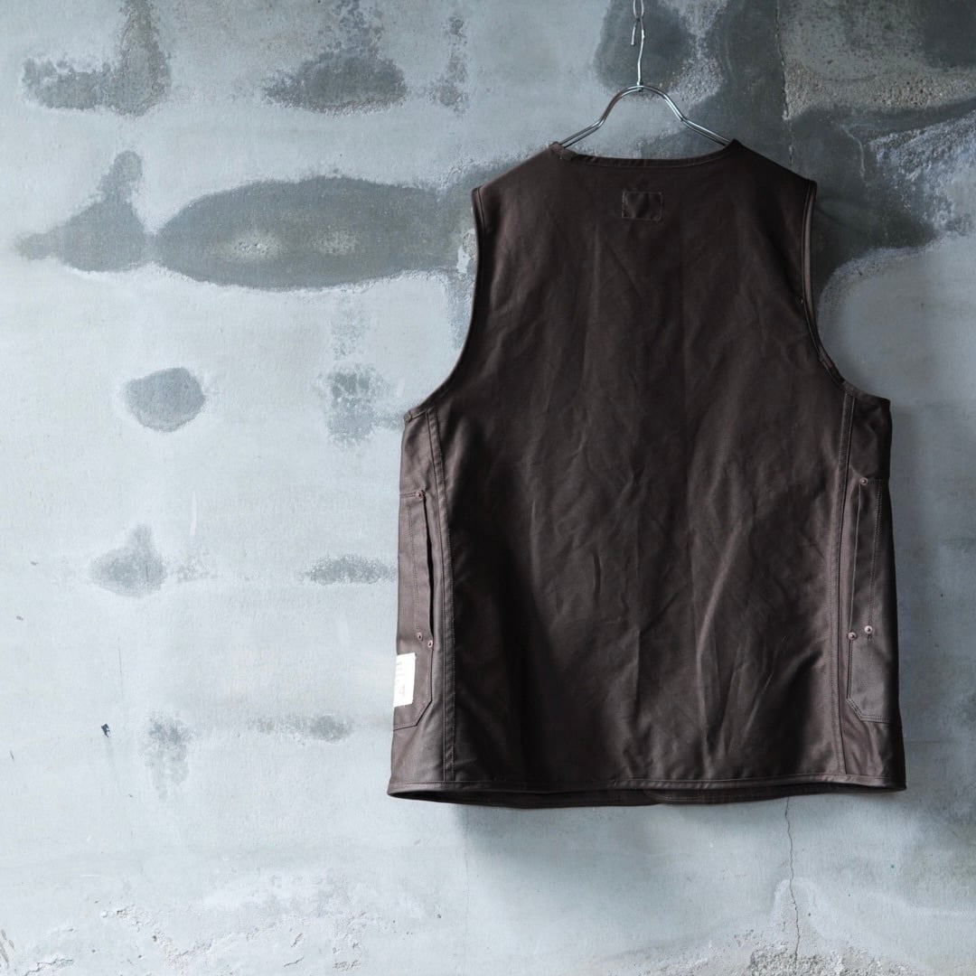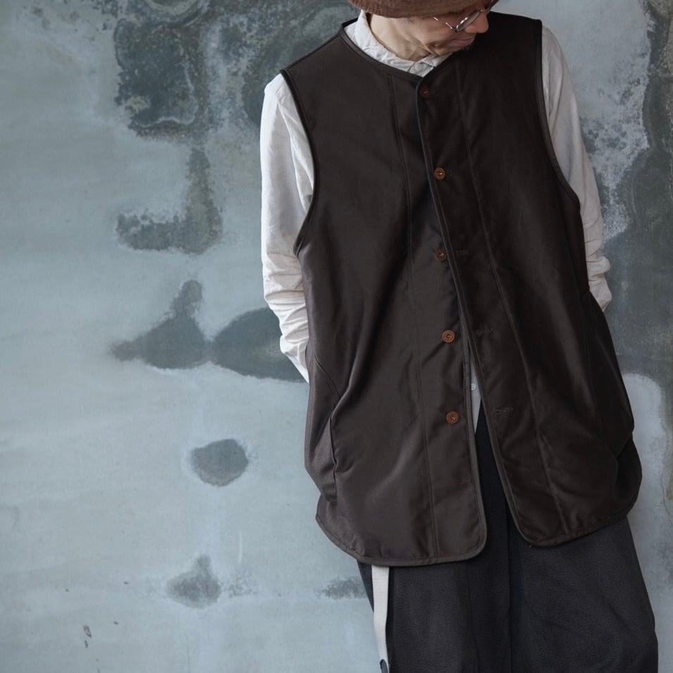 深い色味と艶感のある国産のモールスキンを使用した、ジャーキンベスト。