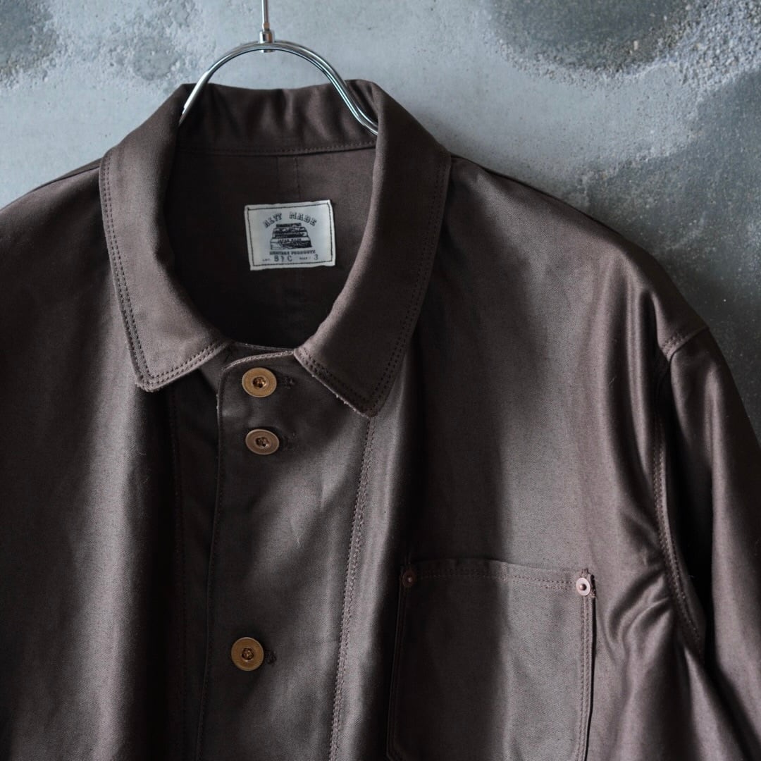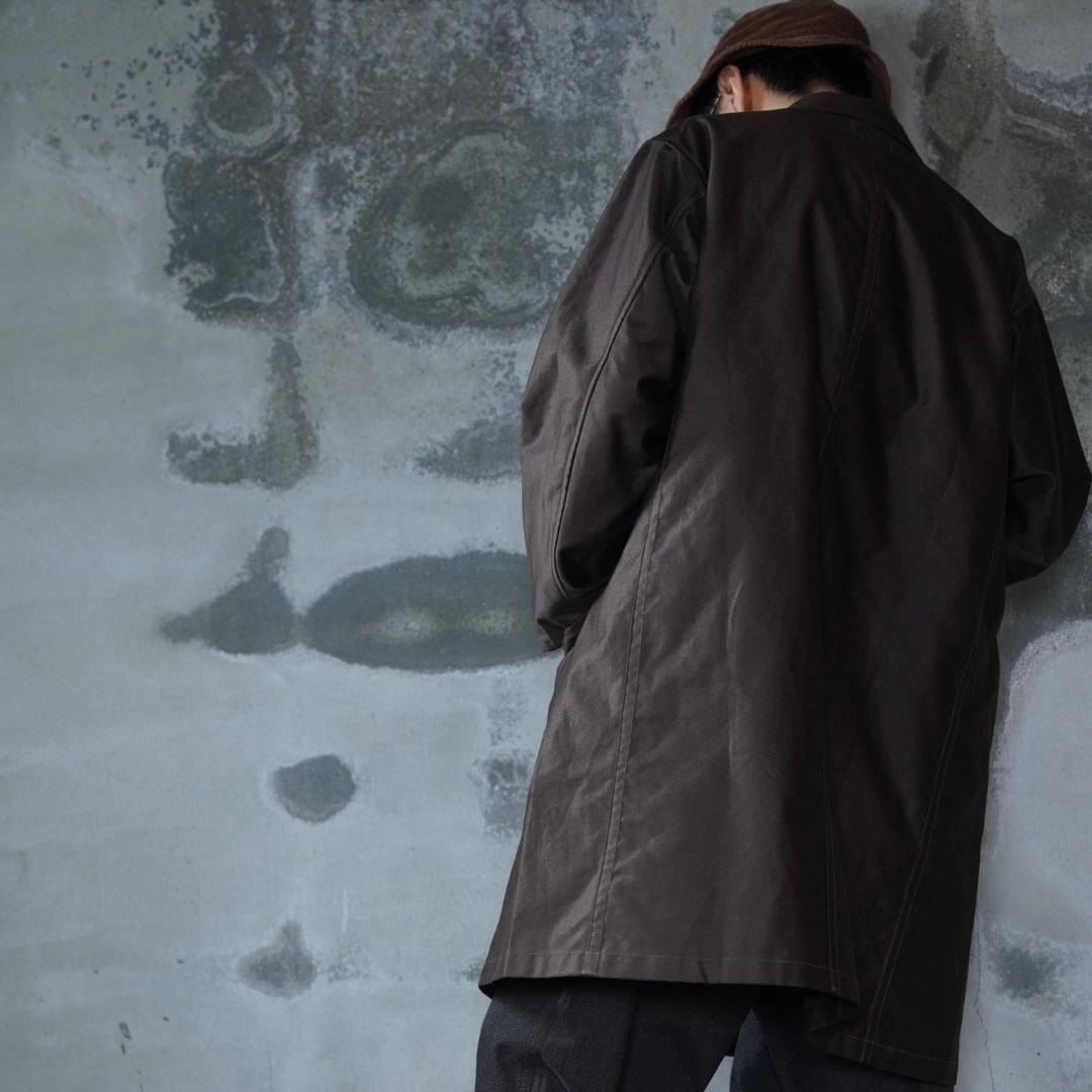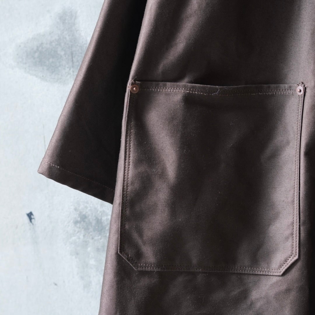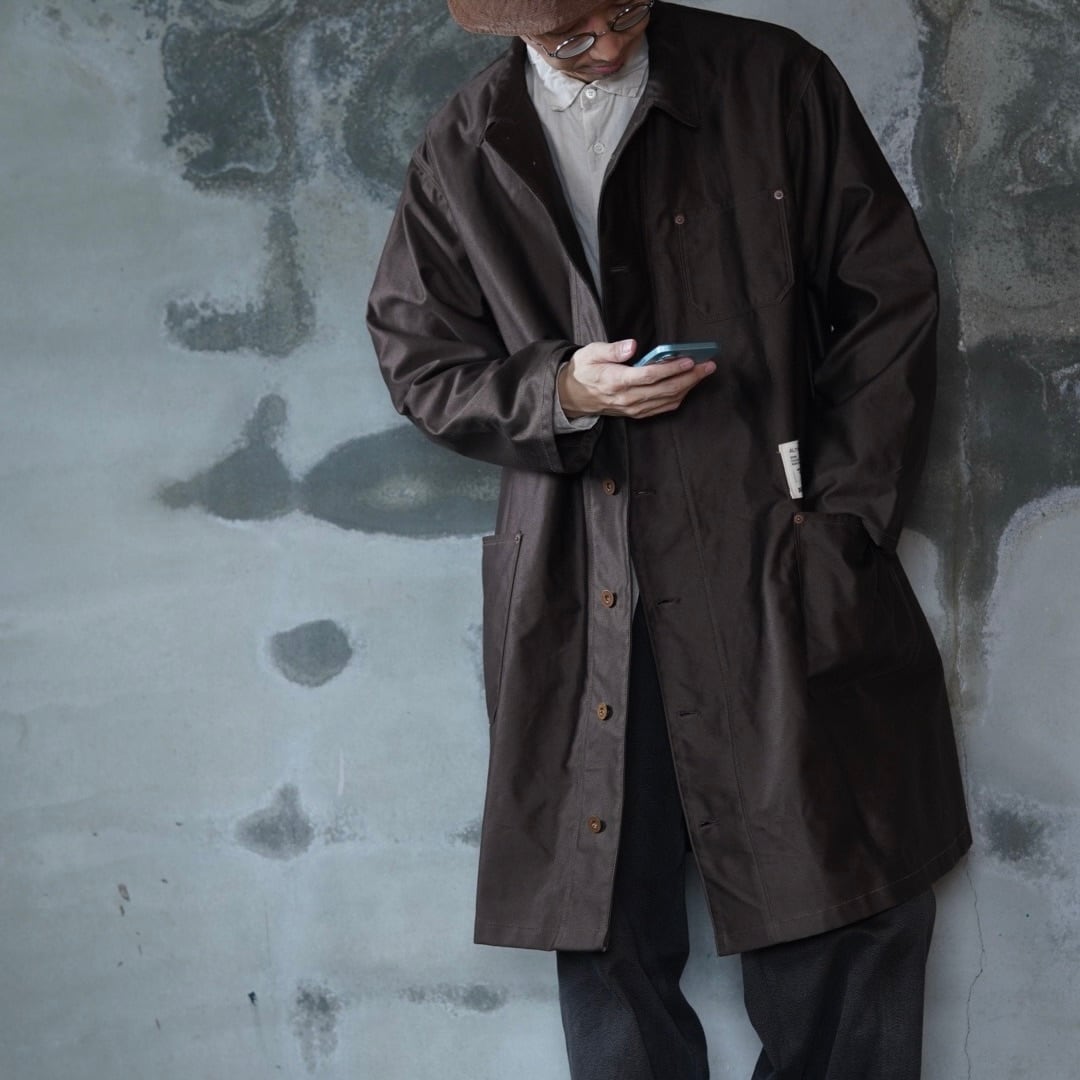 深い色味と艶感のある国産のモールスキンを使用した、一重のショップコート。