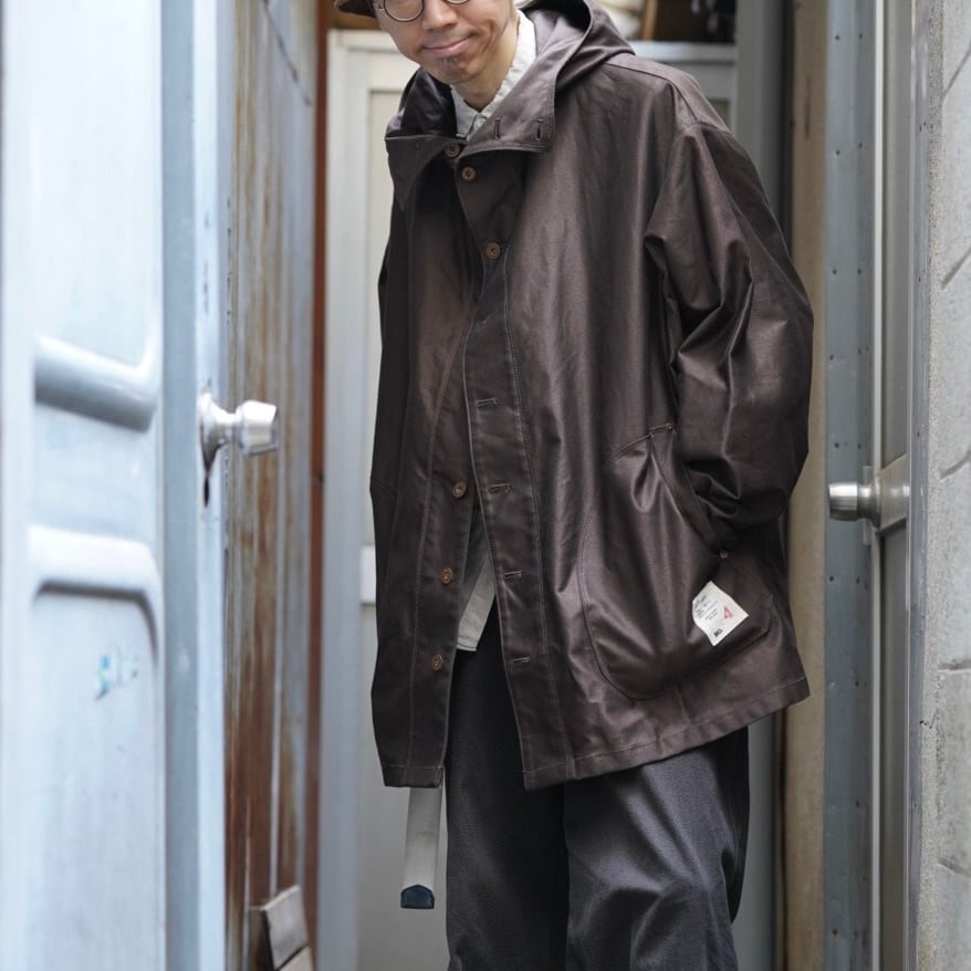 テント生地ほどの厚みと目の詰まりがギアとしての洋服の側面を支えながら、色の深みや光沢とのコントラストが洒落着としての魅力を引き立てます。