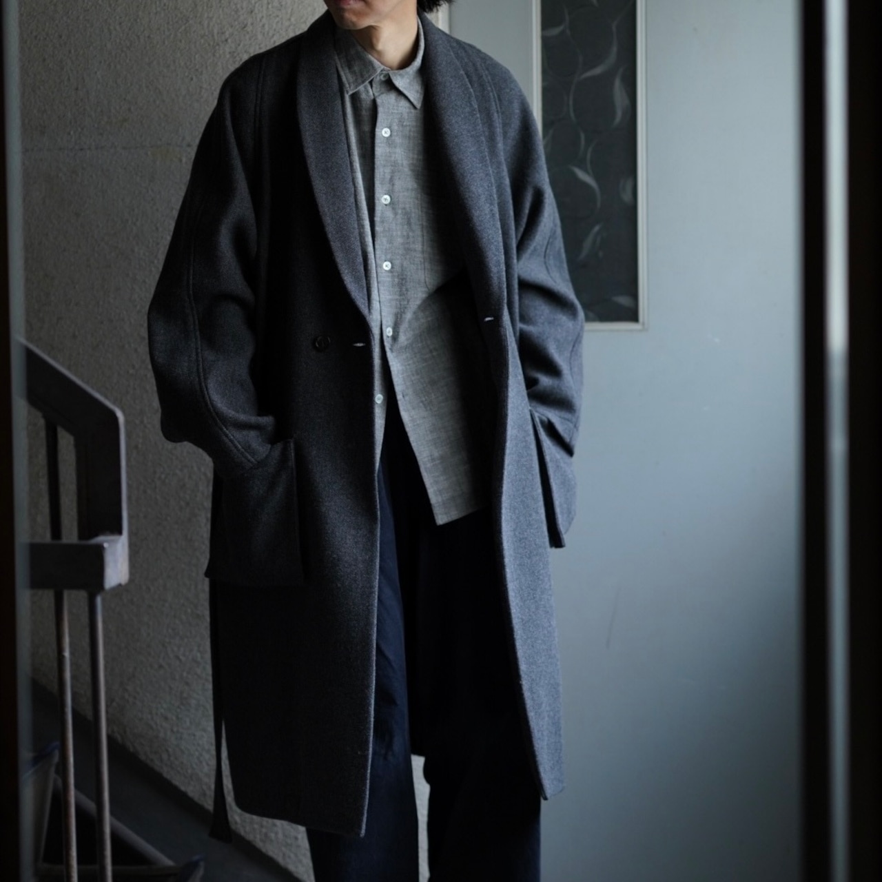 十分な丈と分量を備えた、ショールカラーのベルテッドコート。