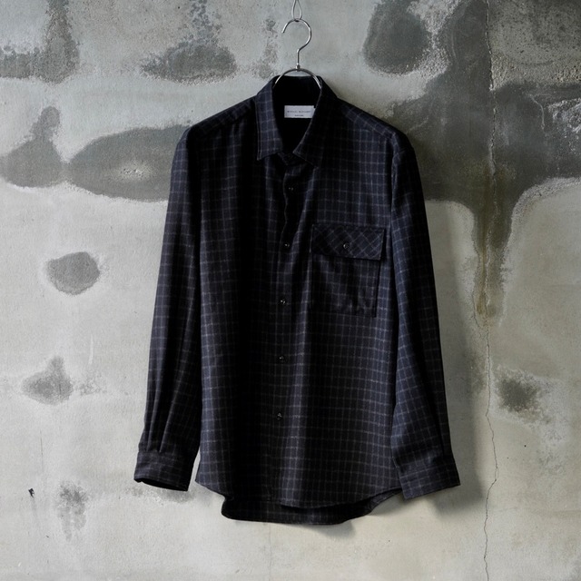スクエアで緩い表情のウールシャツ。 フランクながらもコットンとは違ったウールの艶やかさがある。 スクエアなフラップポケットと小ぶりの猫目ボタンのコントラストが面白く、前たてや袖のボタンと剣ボロのボタンを変えているあたり、シャツブランドの矜持が見え隠れする。 ウールの表情に溶け込むような、甘いドットストライプで構成された二筋格子と、ツィードのような塊感のある杢調のチャコールの2色。 地肌が触れる台襟や袖口の内側とヨーク裏に細畝のコーデュロイを当ててあるので、着心地が良い。 家庭でケアできるのも使い勝手の良い洋服です。 Material : wool 90%, nylon 10% Color : bk check, charcoal Size : 2 肩幅 : 49cm 身幅 : 58cm 着丈 : 77cm 袖丈 : 61cm Size : 3 肩幅 : 51cm 身幅 : 60cm 着丈 : 79cm 袖丈 : 62cm 詳しくはお問合せください。 お電話、メール、インスタグラムのメッセージ。 なんでも結構です。