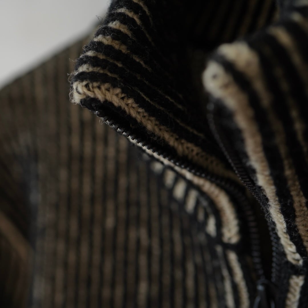 バイカーが愛用するドライバーズニット。 高いネックに体にフィットするデザインを、ボックスシルエットにしウエスト周りにゆとりを出すことで、日常のシーンで使いやすいバランスです。 ハンドルを握るために長く設定された袖は、リブではなく編み数を減らし絞ることでロールアップしてもすっきりとする。 ジップにはレザーの引き手をつけてあり、加締まり艶が出ると良いコントラストになりそう。 ニット本体は毛刈りから紡績、編み立てまで全ての工程を国内でおこなっている稀有な洋服です。 毛糸に残した植物の茎片や種がヴィンテージな空気感を彷彿させる仕上がりと、抜群の嵩高性とを楽しんでください。 Material : wool 100% Color : stripe, black Size : 1 肩幅 : 46cm 身幅 : 54cm 着丈 : 60cm 袖丈 : 73cm 他、詳しくはお問合せください。 お電話、メール、インスタグラムのメッセージ。 なんでも結構です。